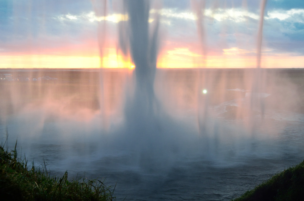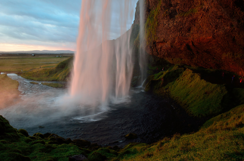 Еще один очень известный водопад - Seljalandsfoss. К нему спешили как могли, солнце садилось, уже зацепилось за горизонт.