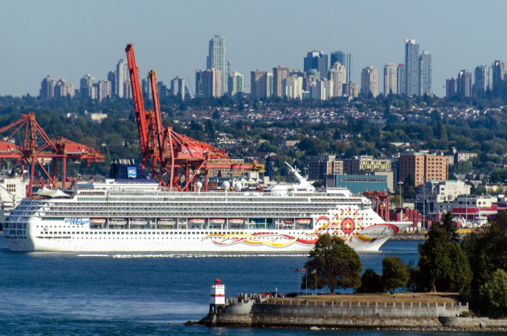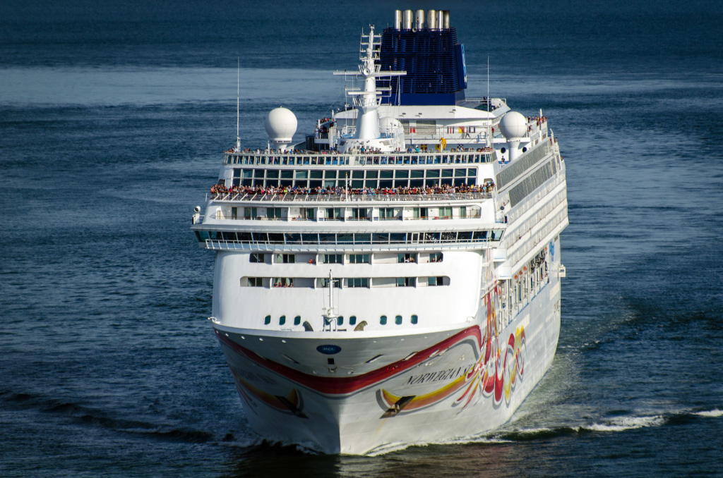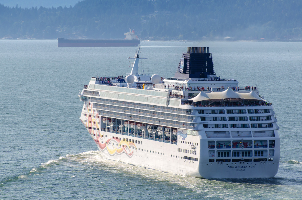Norwegian Sun. Построен в 2001-м году в Германии. Водоизмещение - 78,309т, длина 258 метров, ширина - 33м. 13 палуб, 2002 пассажира и 968 членов экипажа.
