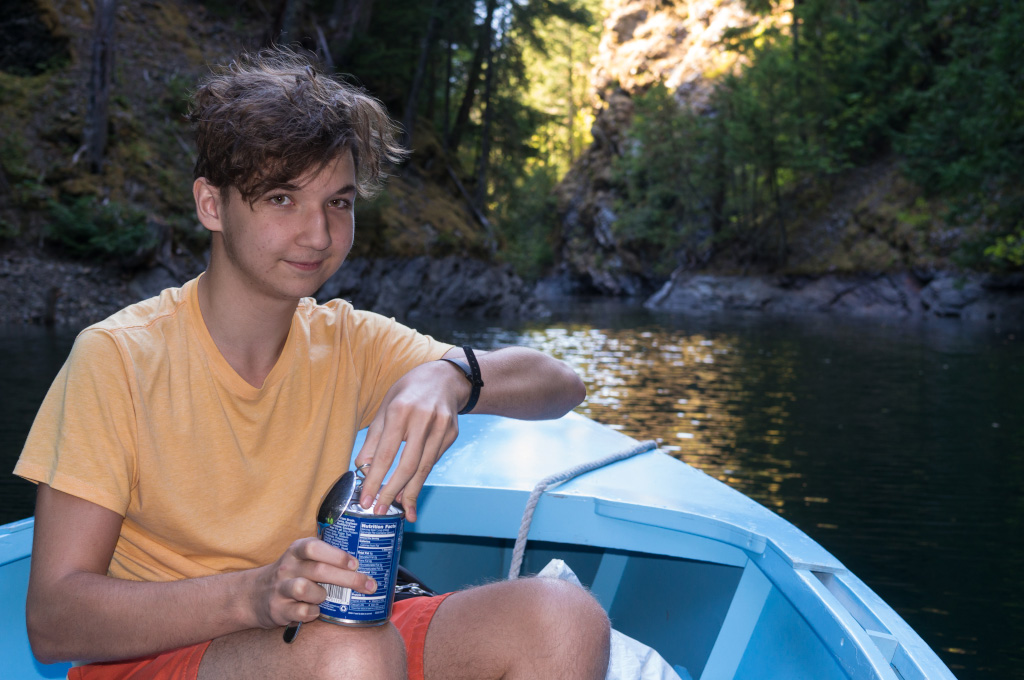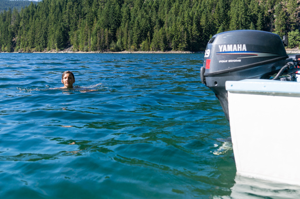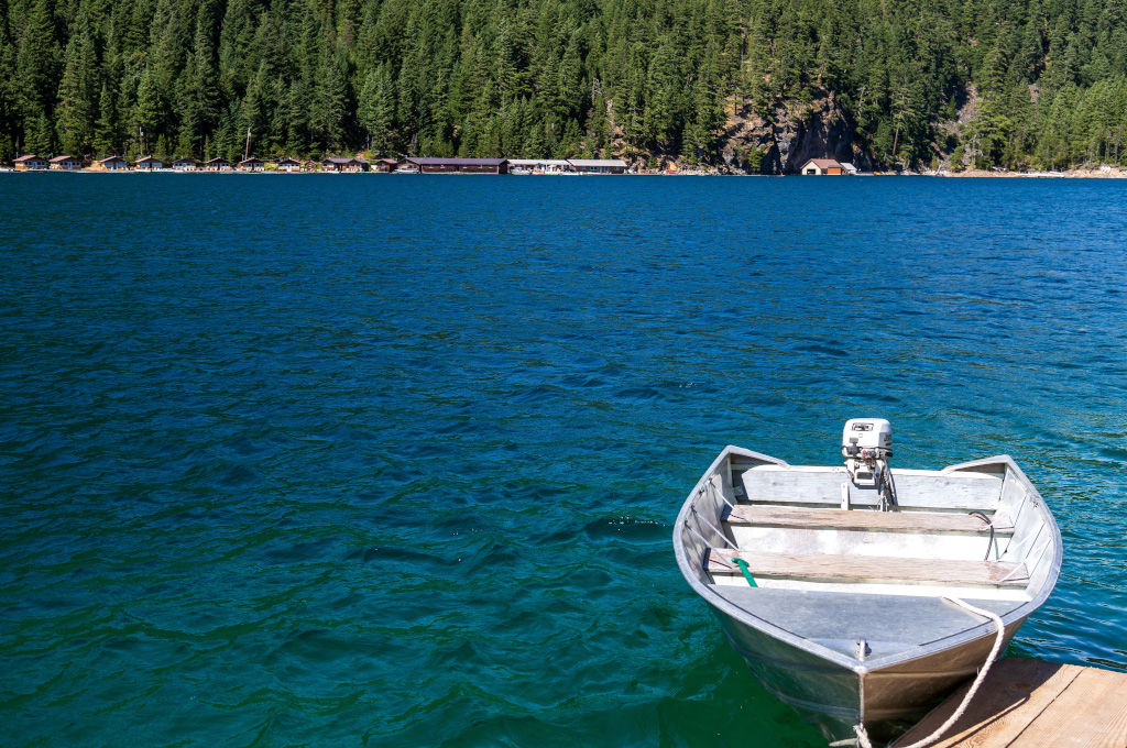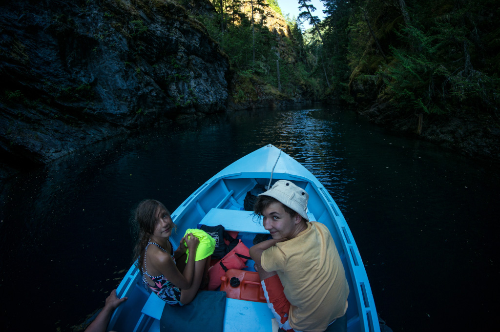 Понятное дело, после всех этих упражнений на свежем воздухе хотелось скорее взять лодку и перейти к водным процедурам. Но к озеру еще надо было спуститься. Более того, лодку на прокат можно взять только в небольшом резорте, расположенном на другом берегу озера. Спустившись к озеру, мы нашли столб, а на столбе обнаружился телефон. Я снял трубку телефона и покрутил ручку сбоку. В трубке сперва что-то зашуршало, а потом далекий голос сказал, что за нами сейчас пришлют катер.