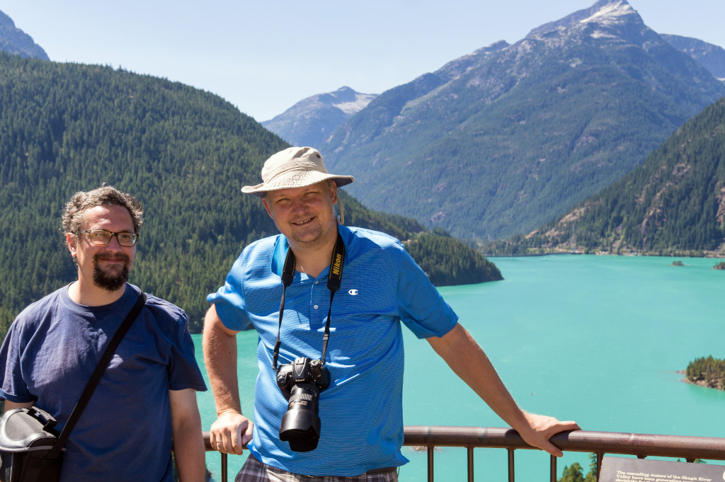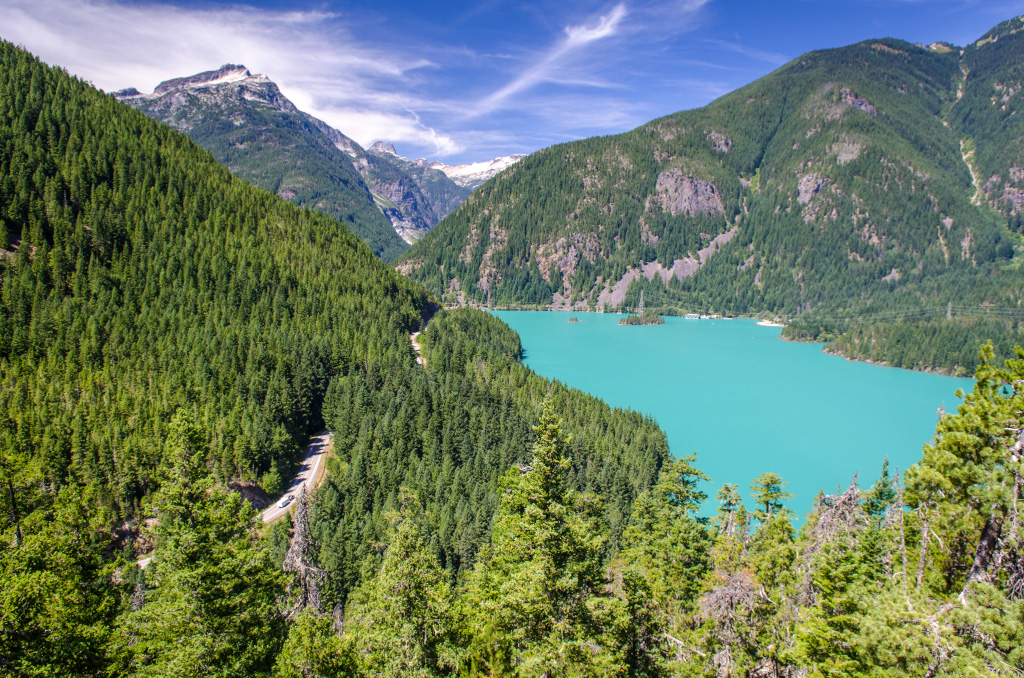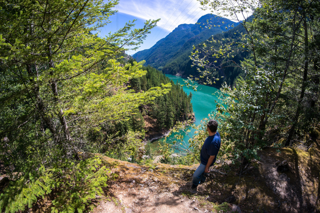 На Северные Каскады у нас были обширные планы. Утром - залезть на Громовую Шишку (Thunder Knob), посмотреть оттуда на купоросное озеро Diablo, а потом зарентовать моторную лодку и отправиться на ней по озеру Ross к Каньону. Все это потом, а сперва первым делом остановились на вьюпоинте в западной части озера Gorge.