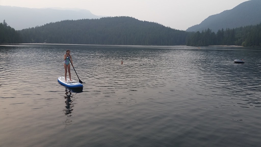 Ксения ходит поливать небольшое деревце на улице рядом с домом - спасает от засухи. Чуть ли не каждый вечер, когда я вечером возвращаюсь с работы, ходим купаться, чаще всего на Сасамат. Купили, наконец, свою надувную SUP доску, и каждый раз берем с собой. Надутая до 12psi, она по твердости напоминает железное дерево.