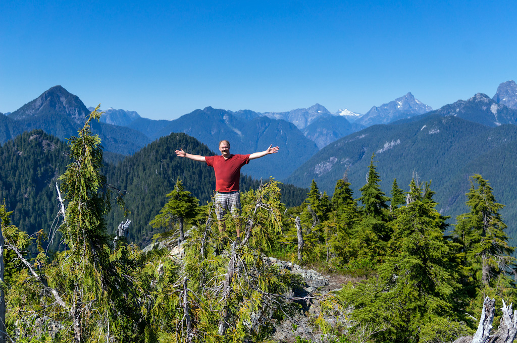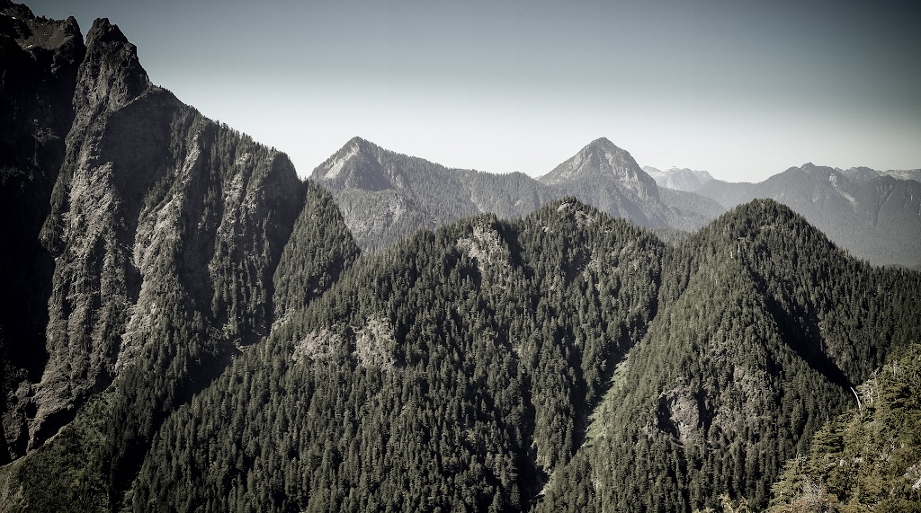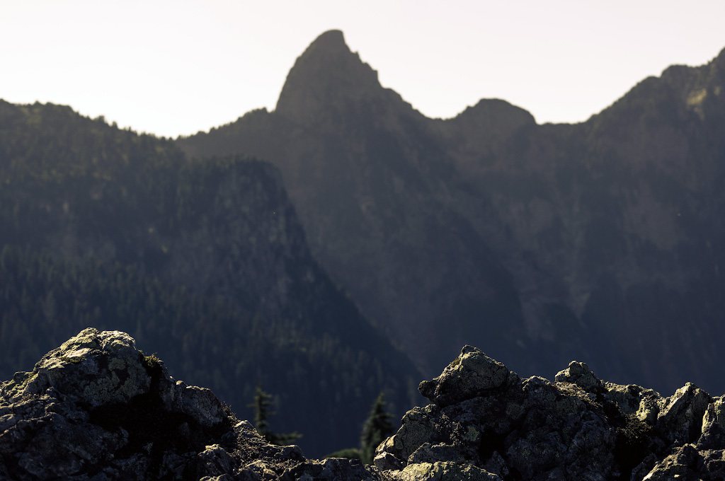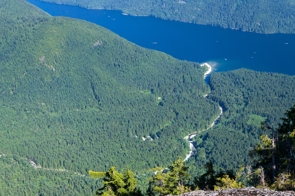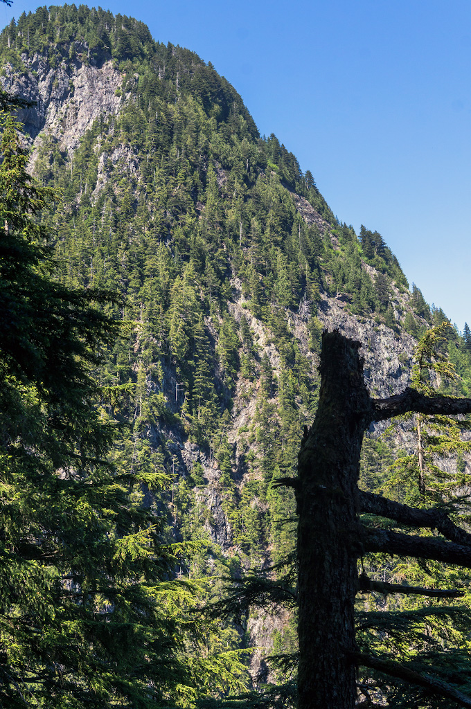Вломили вчера, а мышцы ломит сегодня. А вчера мы, наконец, собрались духом и слазали на Evans peak. Эту гору знают все, кто ходил к водопаду Gold creek Lower Falls в парке Golden Ears. В одном месте там трейл делает поворот, и открывается вид на зеленую воду этого самого Золотого ручья и громоздящийся над всем этим пик - это и есть тот самый Эванс, все непременно фотографируются на его фоне. Пик видно отовсюду: с моста, с парковки, с пляжа - в общем, он давно мозолил нам глаза.