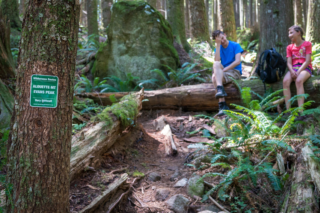 До трейла на пик еще надо пройти пару километров по тропинке на вьюпоинт, где мы недавно спрятали геокеш. Недалеко от вьюпоинта на дереве висит устрашающая табличка: "очень сложный трейл". Мы примерно представляли, что будет сложно, но оказалось еще сложнее. Очень хороший маршрут для воспитания в детях выносливости и воли к победе.