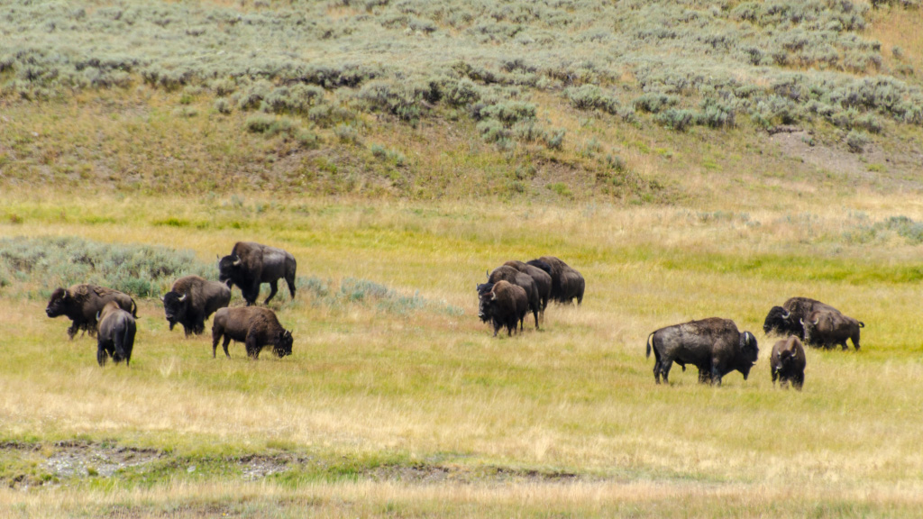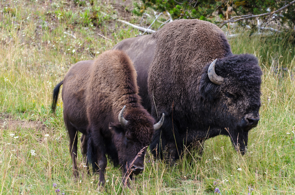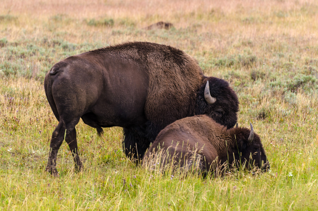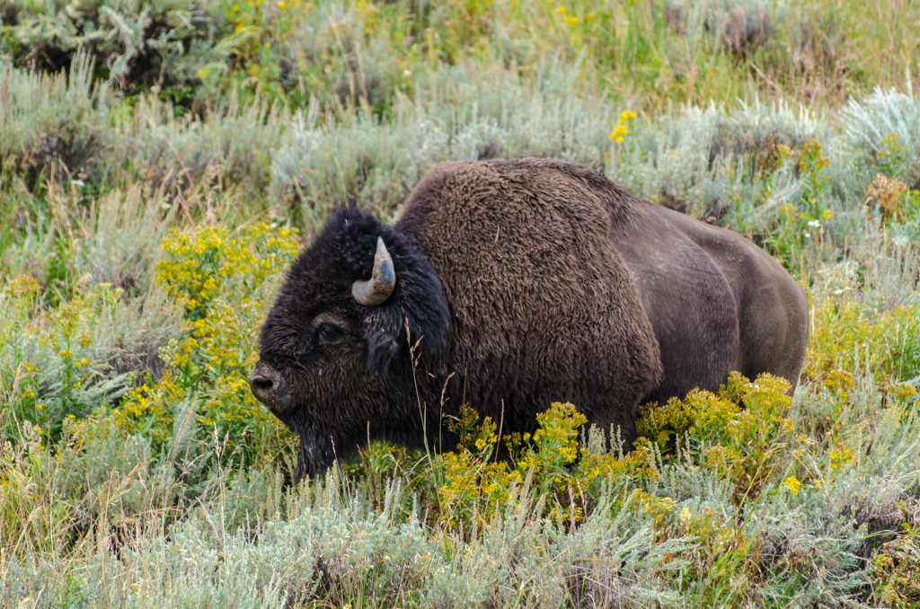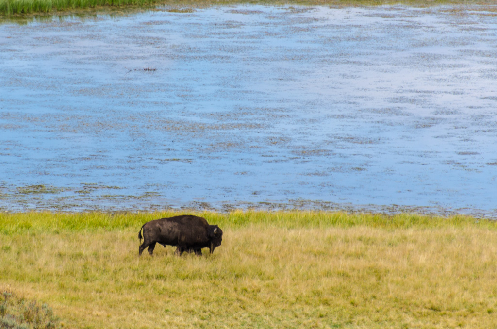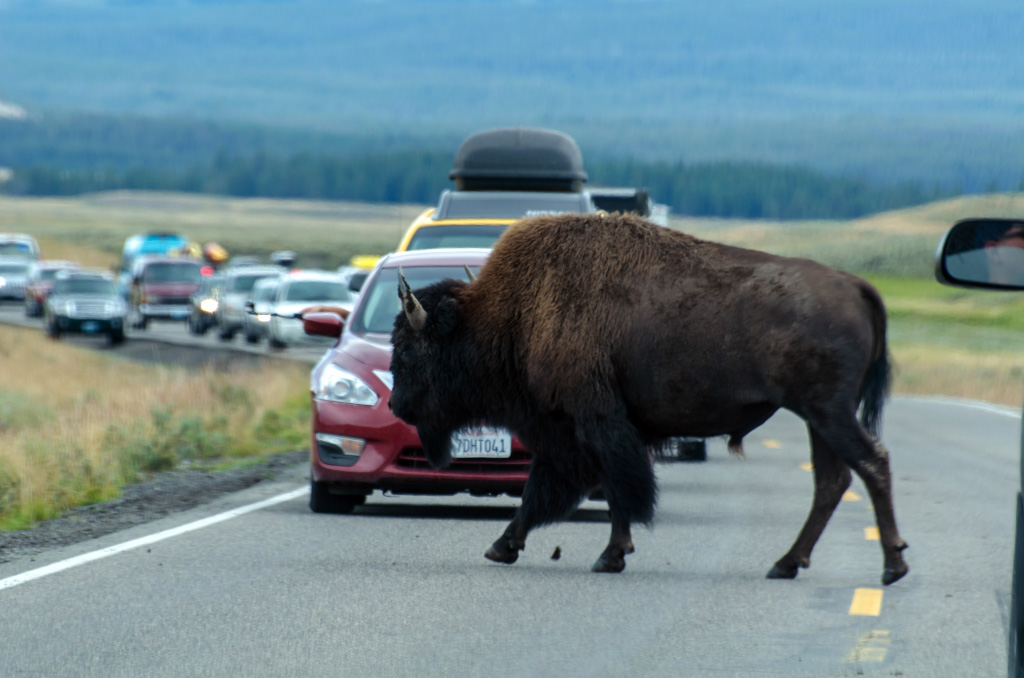 69. Чуть позже мы попали в дикую пробку, в которой ползли часа полтора с черепашьей скоростью. Имея опыт Скалистых Гор, я сразу понял - рядом с дорогой животные, и все останавливаются их сфотографировать. Через час показался первый бизон.