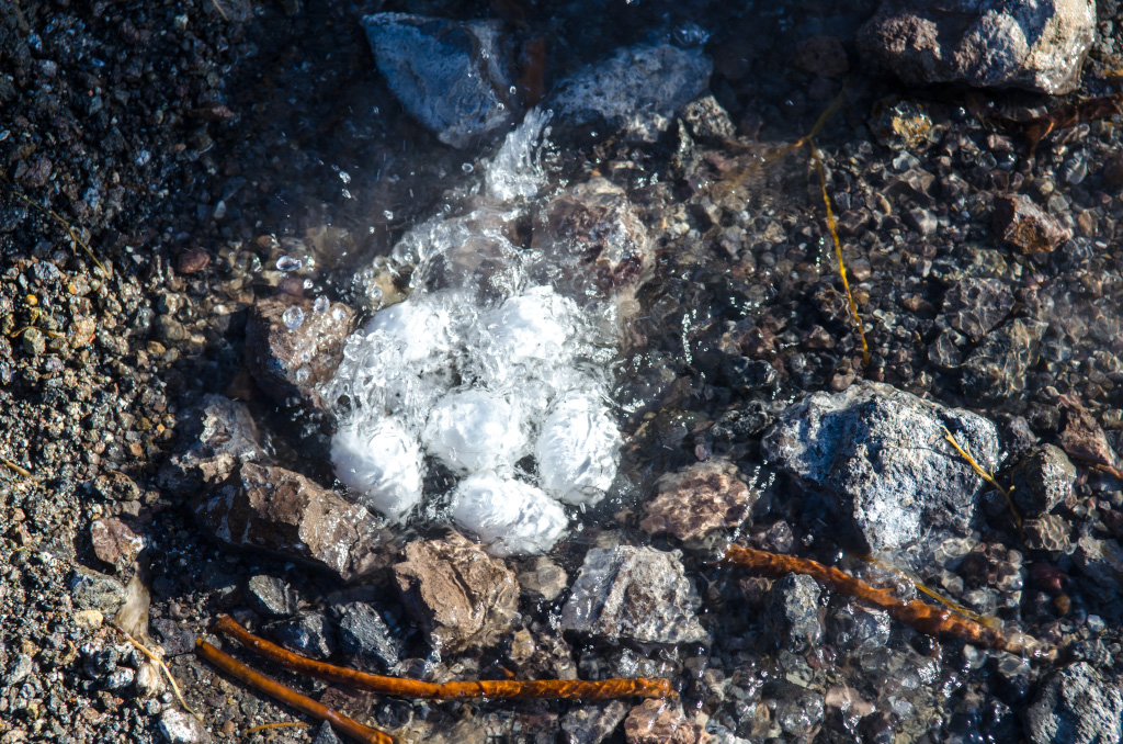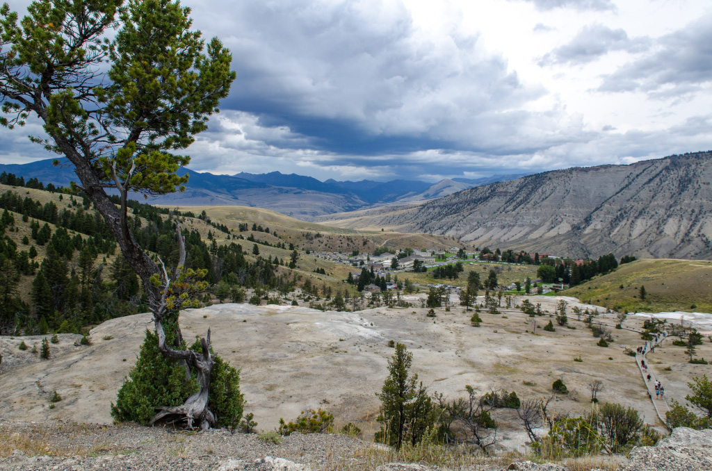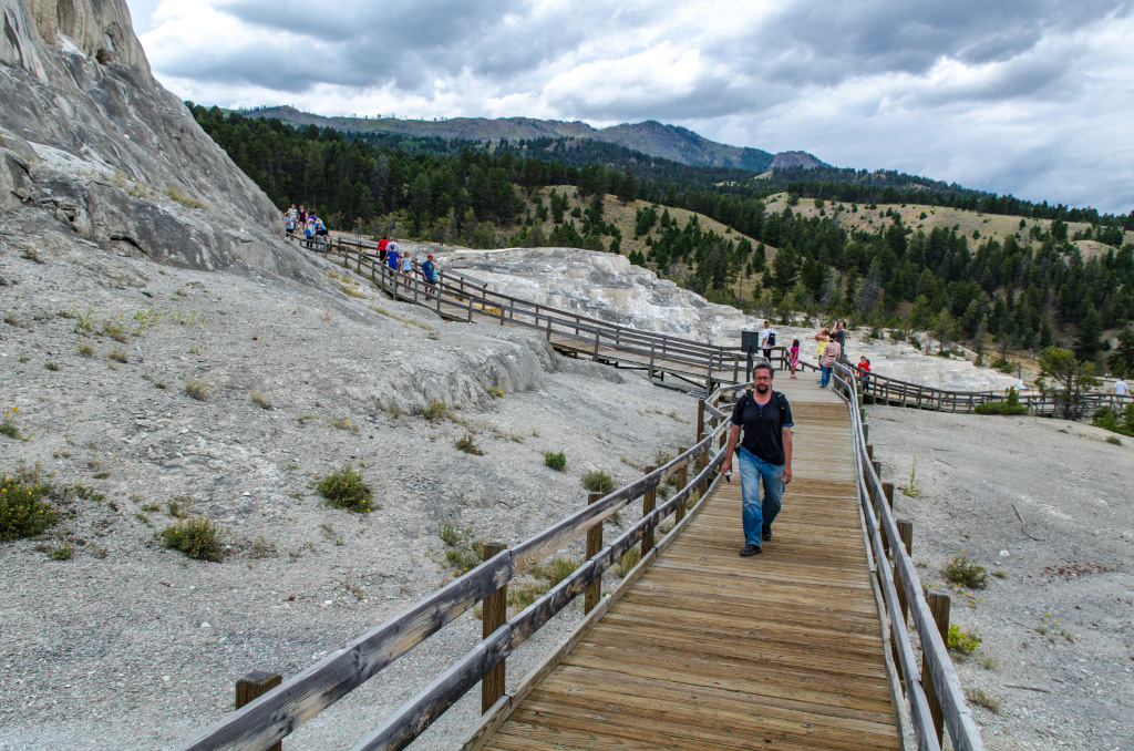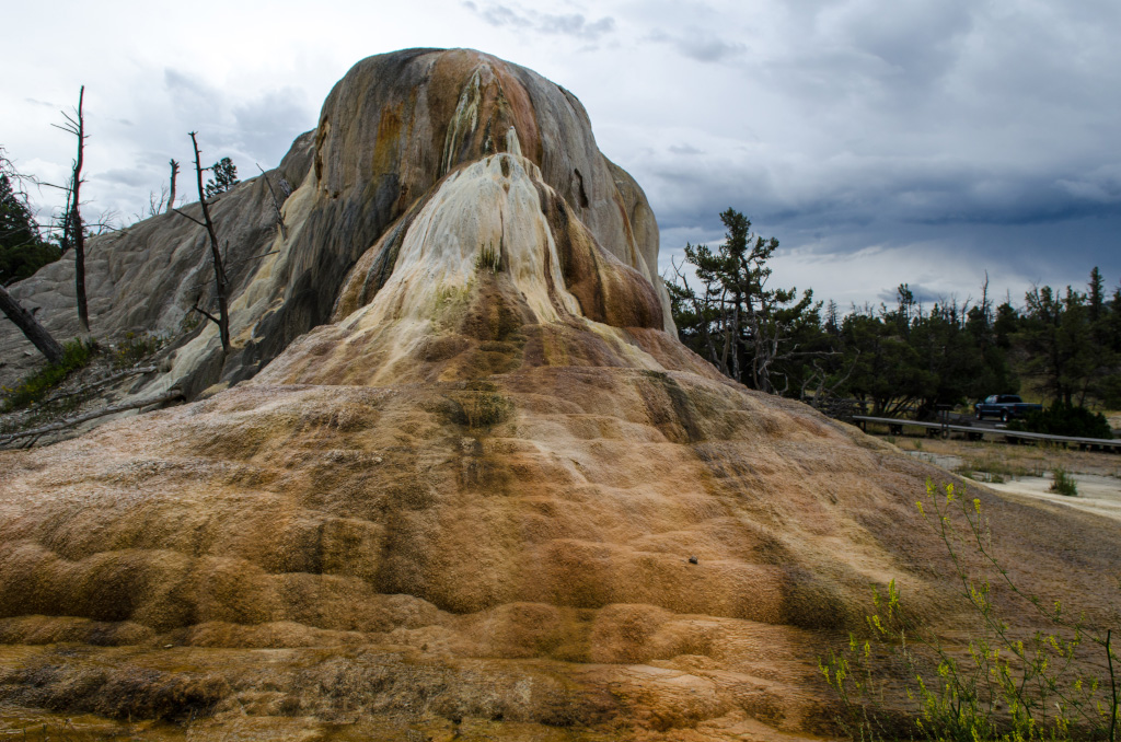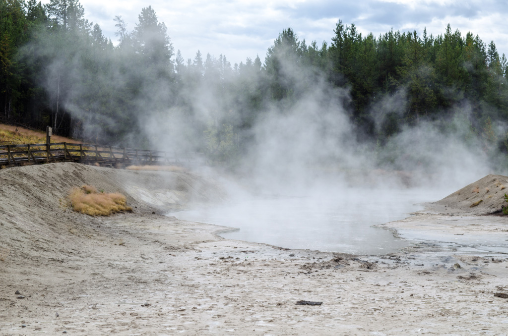 66. На второй день план предписывал проехать по северному кольцу, посмотреть грязевые вулканы, посетить Mammoth Hot Springs, осмотреть попутные достопримечательности и позырить (мой словарный запас иссяк) на всякую живность. Там где были булькающие горячие лужи, заметно пахло сероводородом (наконец-то!).