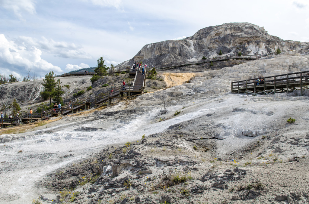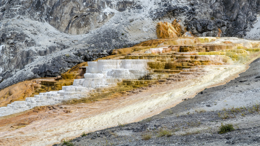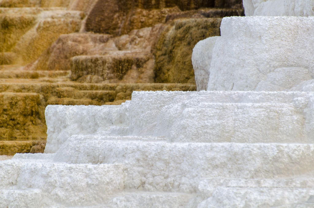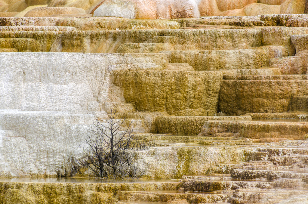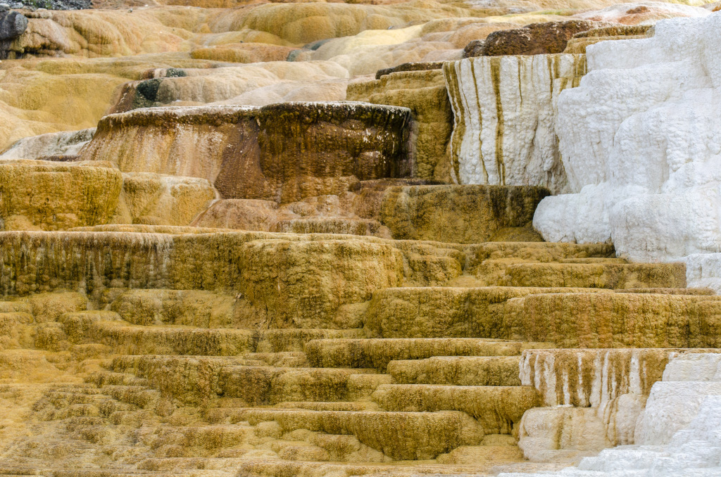 75. Mammoth Hot Springs. По-сути, это известняковые отложения, образовавшиеся от текущих по склону ручьев.