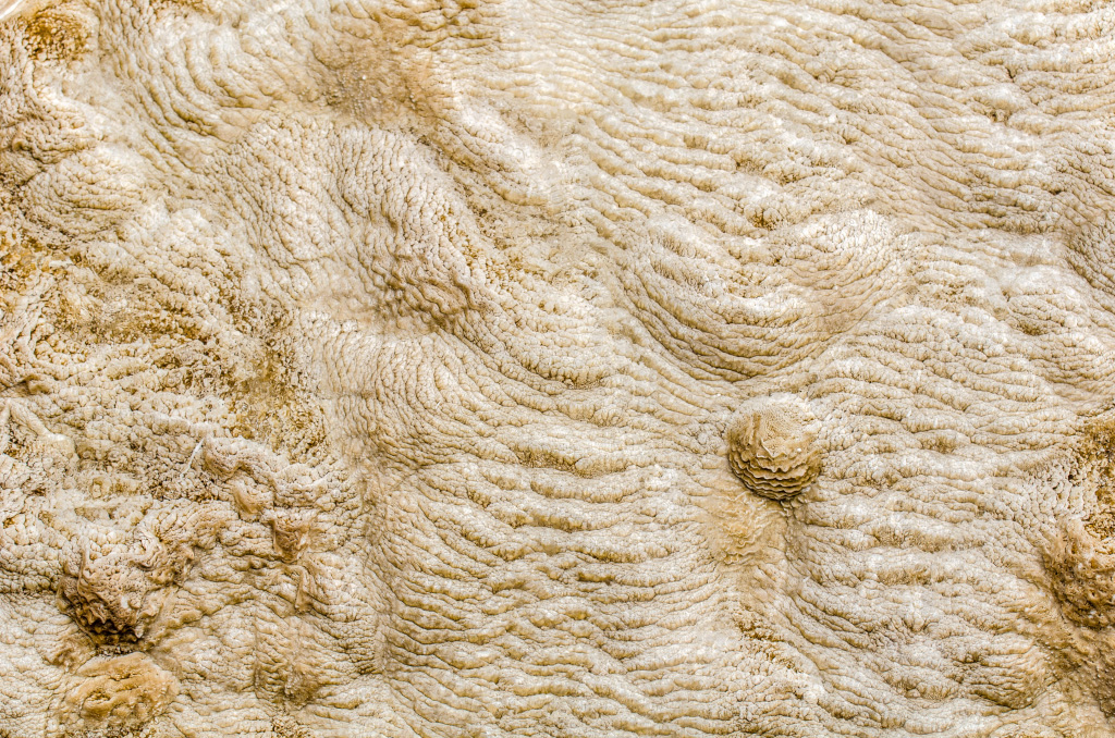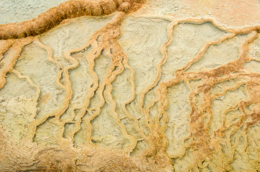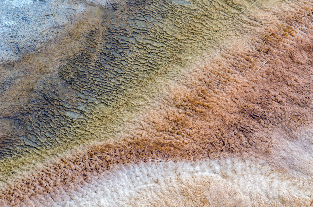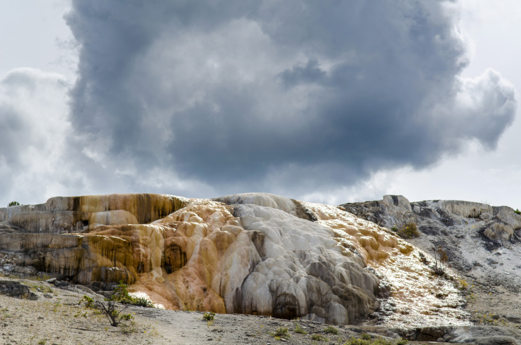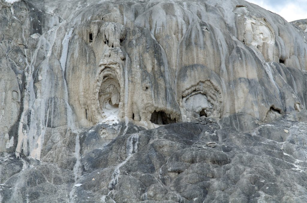 75. Mammoth Hot Springs. По-сути, это известняковые отложения, образовавшиеся от текущих по склону ручьев.