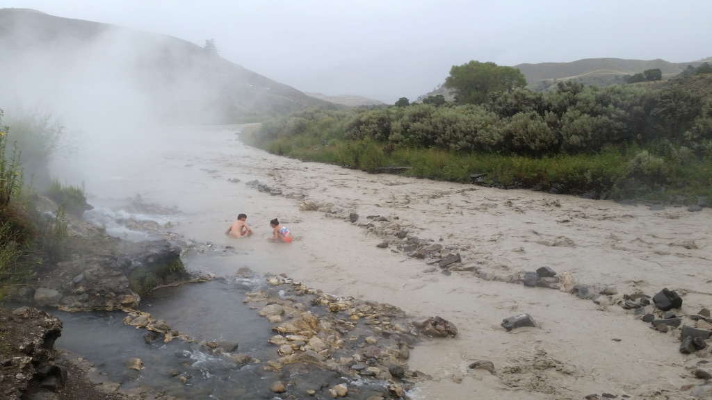 90. И самое интересное - купание в горячем источнике. А то что это за парк, в котором столько горячей воды, но купаться в ней нельзя? А ведь и вправду нельзя. Но есть местечко сразу за северной границей парка, где горяченная река впадает в другую - холодную. Когда мы туда добрались, разверзлись хляби небесные, и начался Всемирный потоп. Ливень, хлестал сплошной стеной не переставая. Сперва мы терпеливо сидели в машине и смотрели на бегущих к своим машинам мокрых людей (от парковки до места купания надо еще пройти около километра), потом они кончились и стало скучно. Я предложил отдеть плавки-купальники и не обращая внимание на дождь, двигать к реке. Все равно купаться, вот и согреемся.