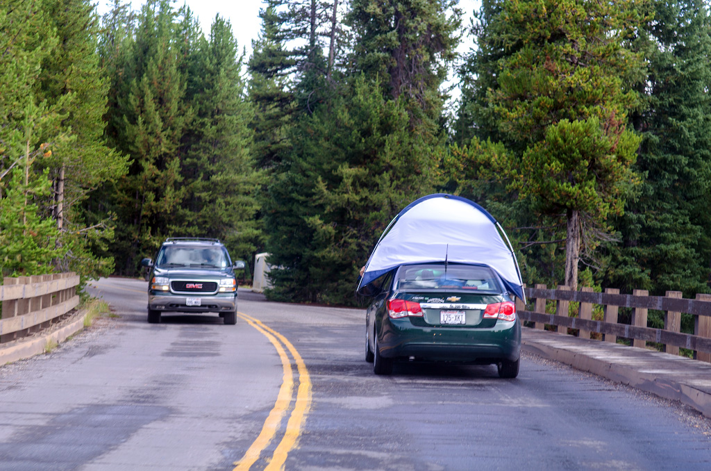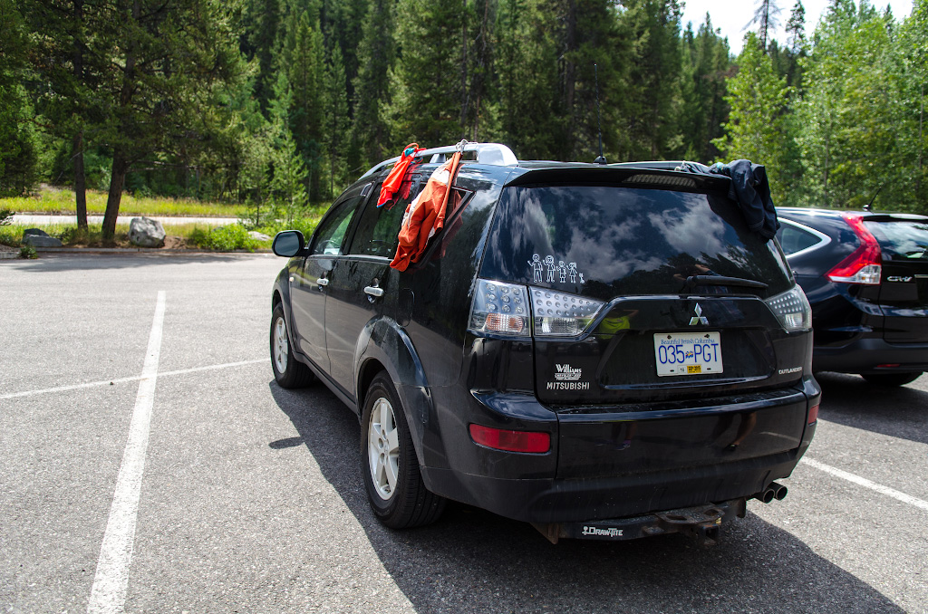 Начали мы свой день с того, что украсили машину как флагами непросохшими от купания намедни в мутной теплой реке плавками, сложили палатки (их закончен полет) и покатили дальше на юг - в Тетоны.