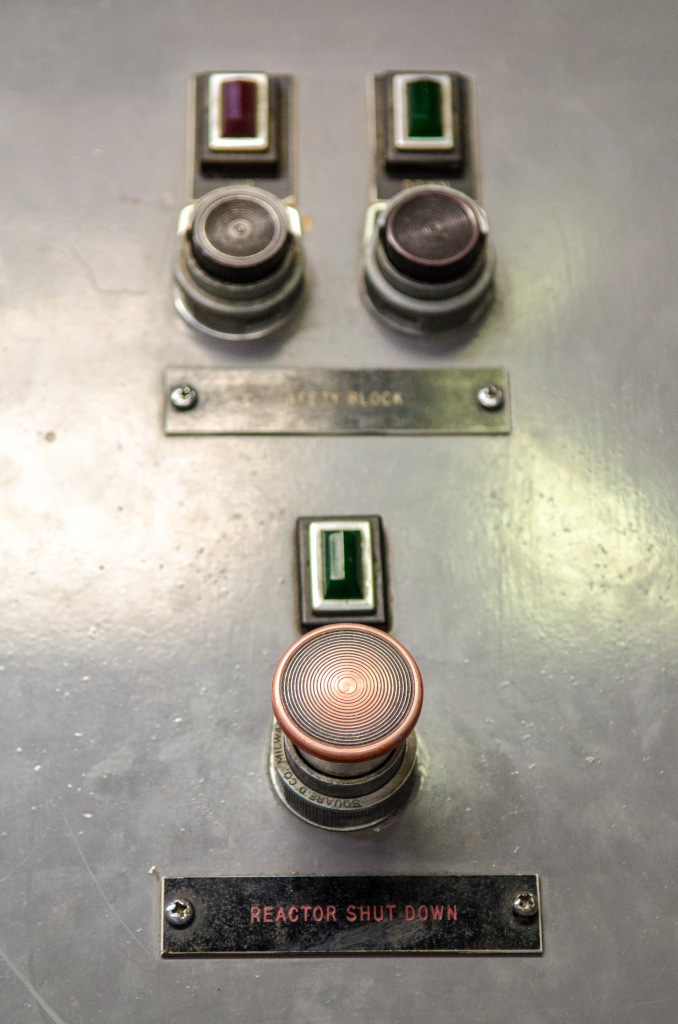 Знаменитая Кнопка SCRAM. На самом первом реакторе эта кнопка управляла лампочкой, а рядом стоял Человек с Топором, готовый при сигнале опасности перерубить канат, на котором висели замедляющие стержни. Отсюда и название "Safety Control Rod Axe Man" - человек с топором. Хотя это, конечно, очередная шутка, придуманная физиками. В действительности это Safety Control Rods Activator Mechanism - механизм, а не человек.
