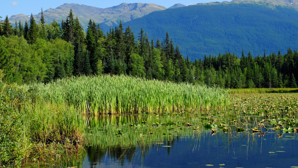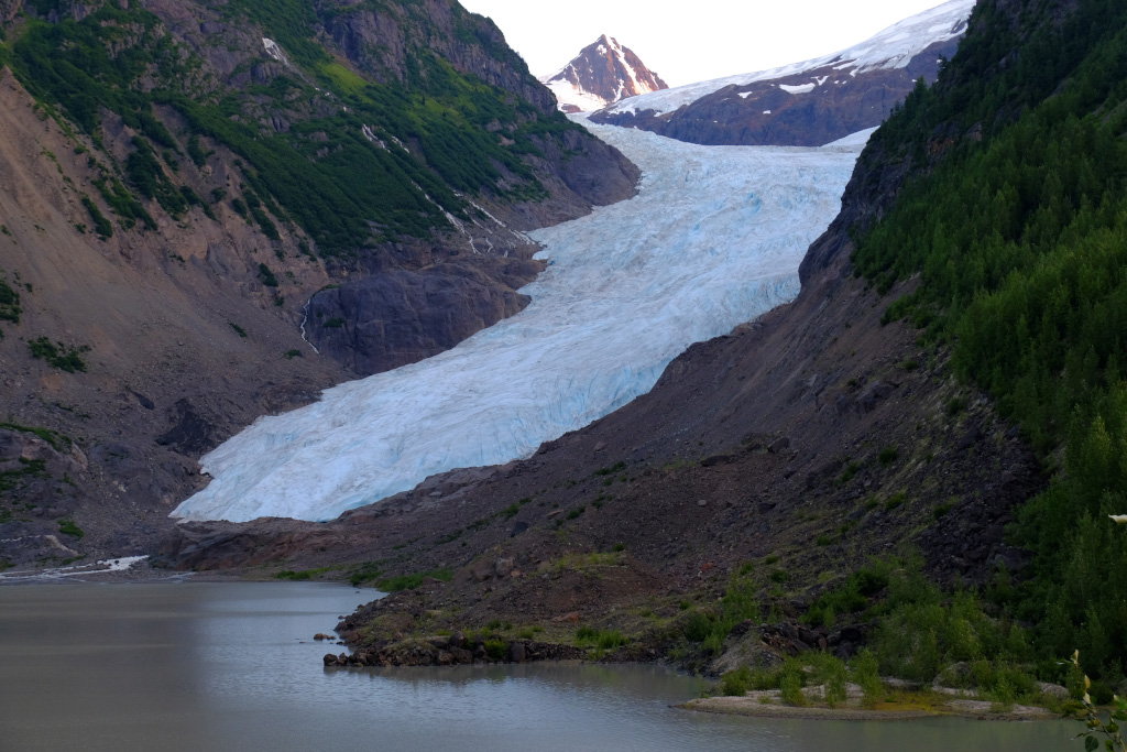 Сразу после этого мы видели семью черных медведей, играющих друг с другом, но были так зачарованы зрелищем, что позабыли про фотографии. Потом видели гризли, перебегающего дорогу. А потом нас остановили на обочине регулировщики, и мы битый час стояли ожидая пока по дороге провезут какие-то турбины. Из-за этого мы упустили самое фотографическое время на хайвее 37А, и к Bear Glacier добрались только в сумерках.