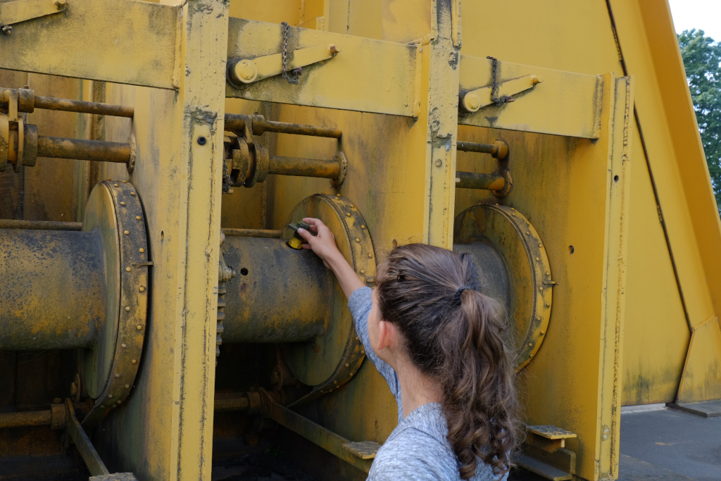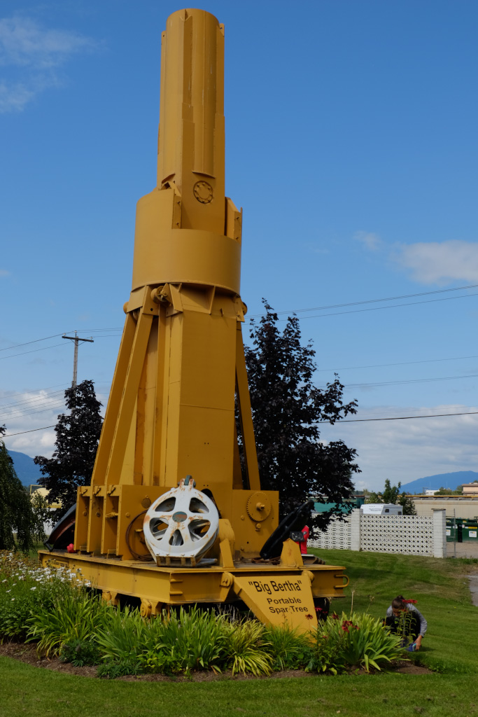 На самом деле, это чисто утилитарный механизм для лесодобычи. Он заменял деревянный столб, к которому крепились тросы. По этим тросам со сколнов спускали бревна. Штука оказалась малотранспортабельной, и вскоре заняла свое место как памятник лесорубам и городская достопримечательность.