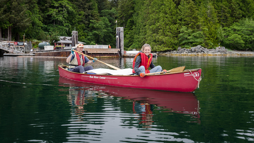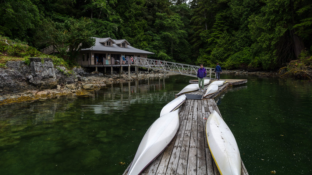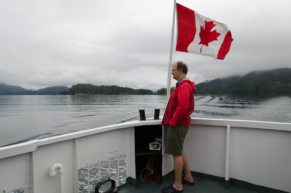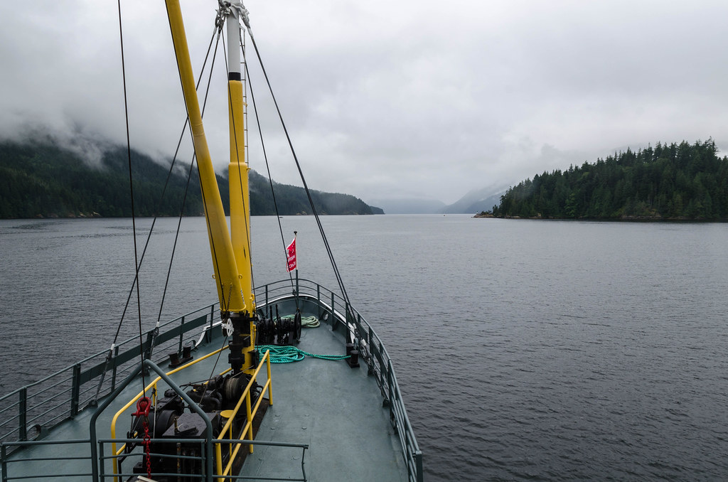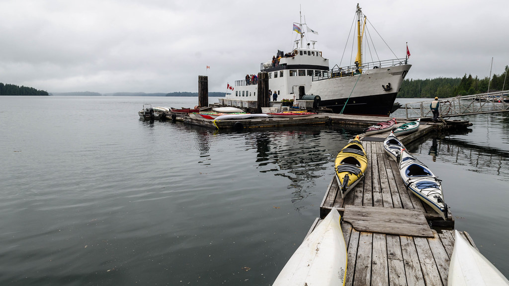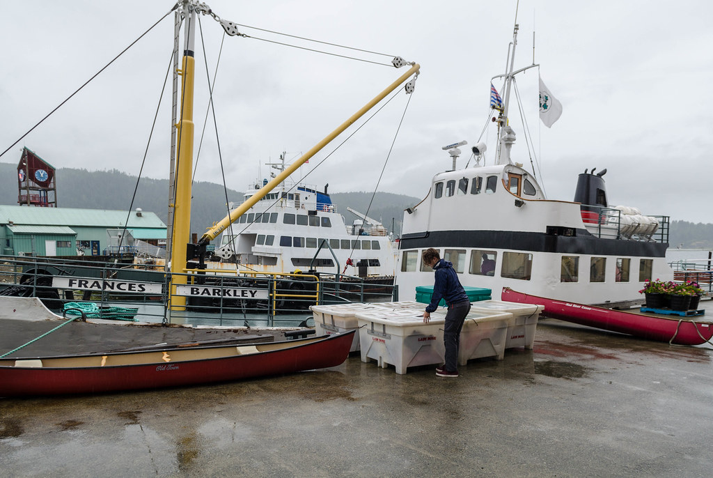 До рая, однако, приходится долго добираться. Сначала мы переправились на пароме на остров Ванкувер, потом доехали до городка Port Alberni, переночевали, а в 7 часов утра в порту нас ждал корабль Frances Barkley, готовый за два часа доставить нас к Sechart Lodge. Вещи мы погрузили в большой белый пластиковый контейнер, подтащили поближе каяк и поднялись на борт занять свои места перед отправлением.