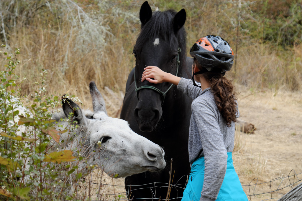 По дороге встретили забавную пару - черного коня и белого ослика и подружились с ними, поделившись своими дорожными припасами.