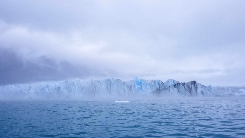 Сперва чувствуем холодное дыхание, а потом в рассеивающемся тумане видим поднимающуюся из воды отвесную стену ледника.