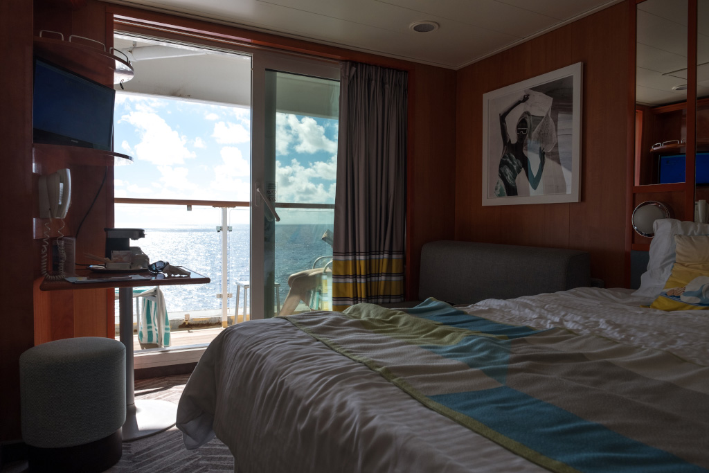 В прошлый раз мы, послушав советы бывалых ("все равно в каюте будете только ночевать"), взяли внутреннюю каюту. На этот раз мы решили настолько не экономить и выбрали каюту с балконом. Разница - принципиальная! Это все равно как жить в подвале или в чудесном аппартаменте на верхнем этаже с окнами на море. Дом один и тот же, а жизнь совершенно разная. В каюте с балконом спишь ночью под шум океана вдыхая свежий морской ветер, утром первым делом видишь бескрайний простор, а не картину на стене вместо окна. И всегда можно выйти на балкон в трусах - хоть и относительная, но прайваси.