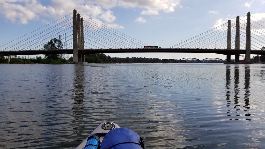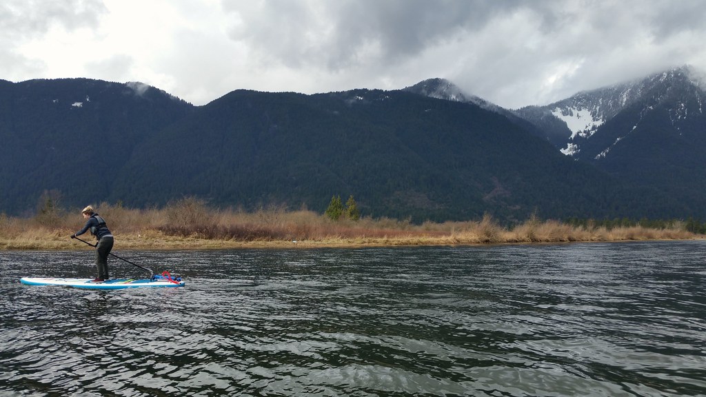 В прошлые выходные Ксения была в кадетском лагере, и я решил предпринять какое-нибудь небольшое путешествие на SUP доске. Давно хотел пройти от Pitt Lake домой в Port Coquitlam. Всегда думал что это рядом, километров 10, ну 12. В процессе оказалось все 22. Да еще был некоторый встречный ветерок, так что нагребся я от души. Обычно на этой реке больше снующих туда-сюда моторных лодок, чем комаров на болоте. Зато в этот раз они все куда-то подевались, и я не только неоднократно пересекал реку, но и большую часть пути греб по самой ее середине.