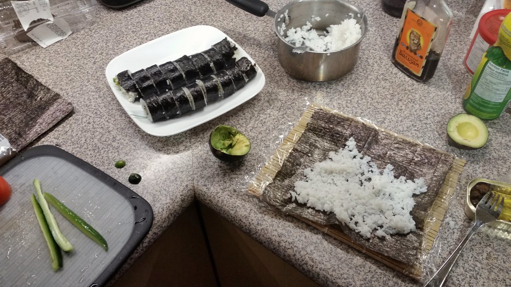 Пока наши девушки были в России, мы с Димой готовили себе сами. Даже вот суши со шпротами изобрели, например.