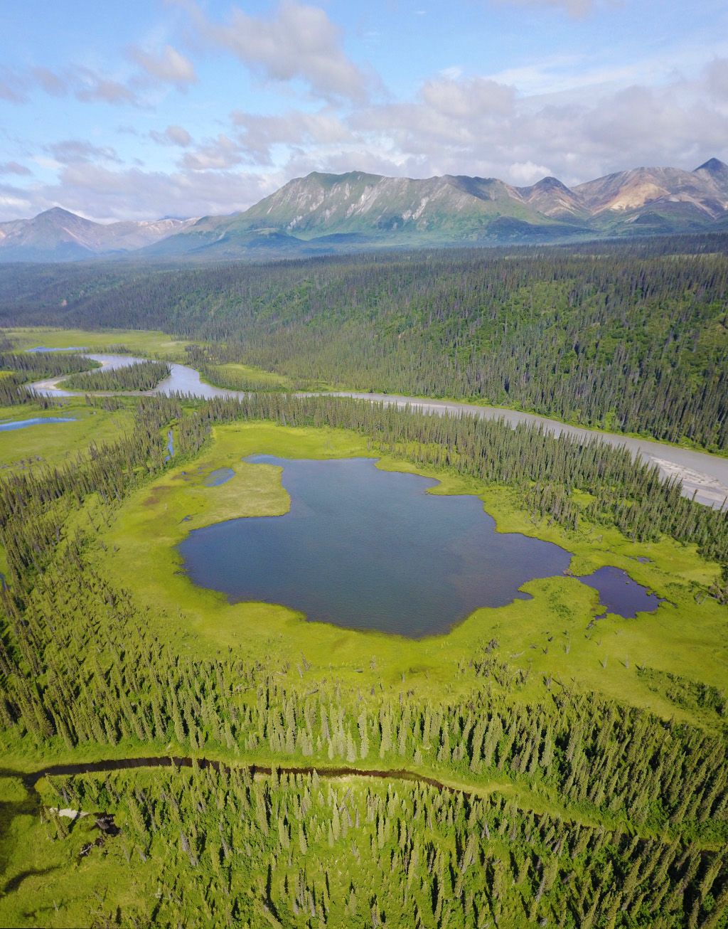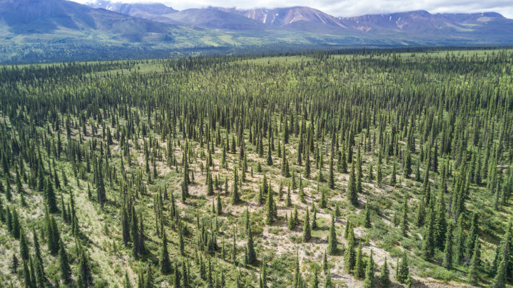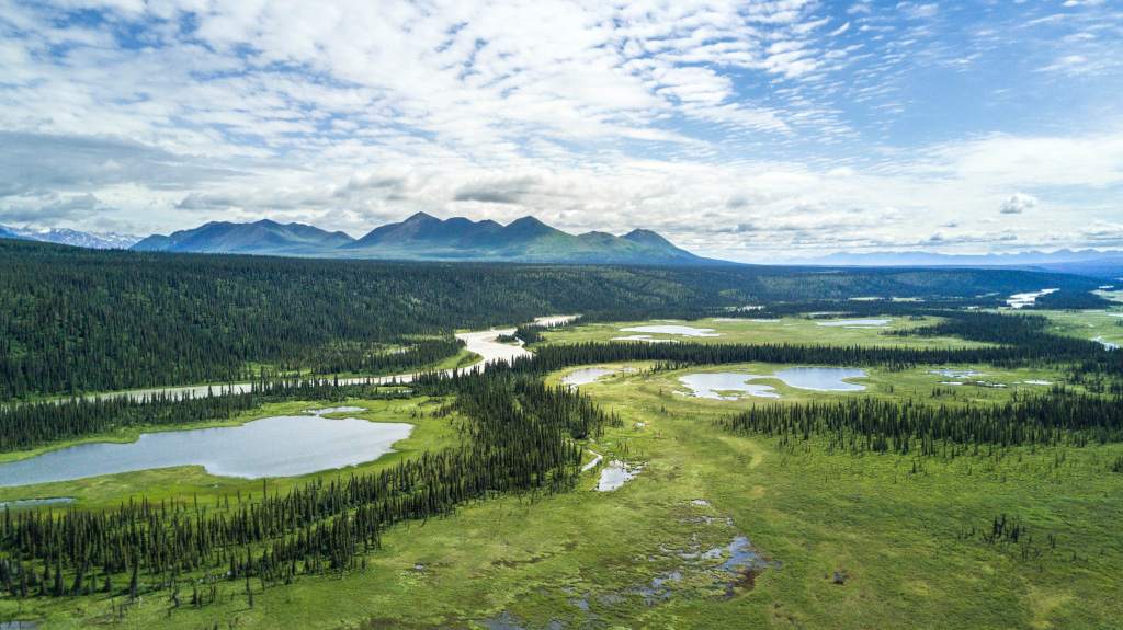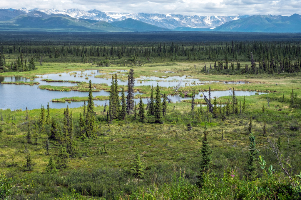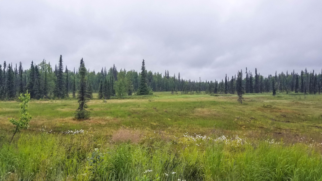 Типичный пейзаж на восток от Анкориджа до Денали - низкорослый лес и болота.