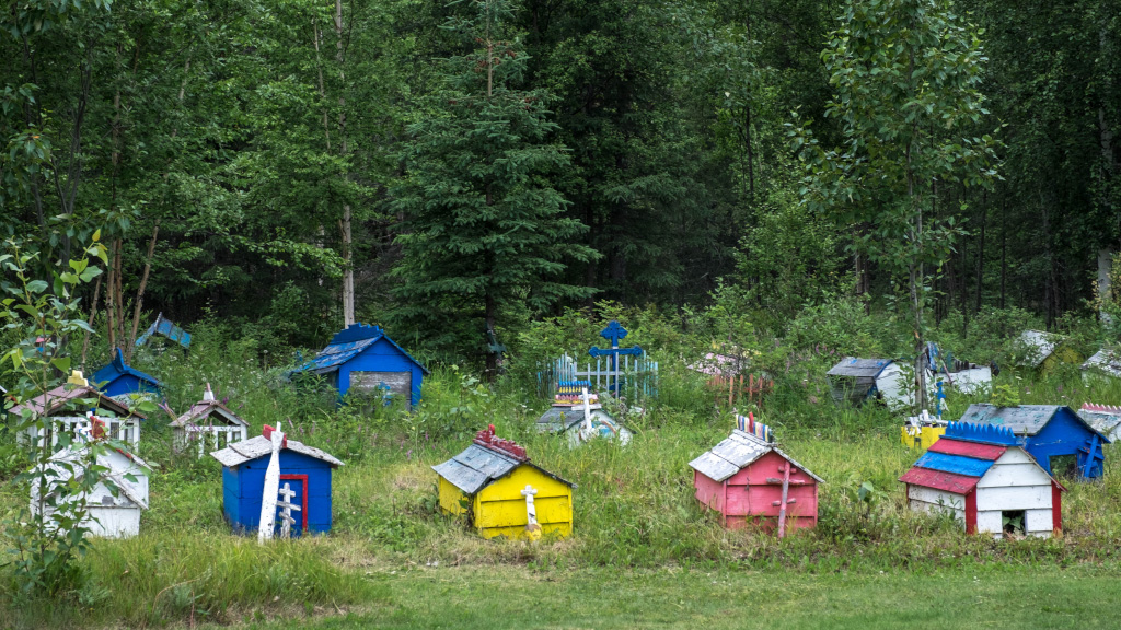 Эти веселые домики - могилы, являют собой сплав православных и традиционных тунгусских традиций