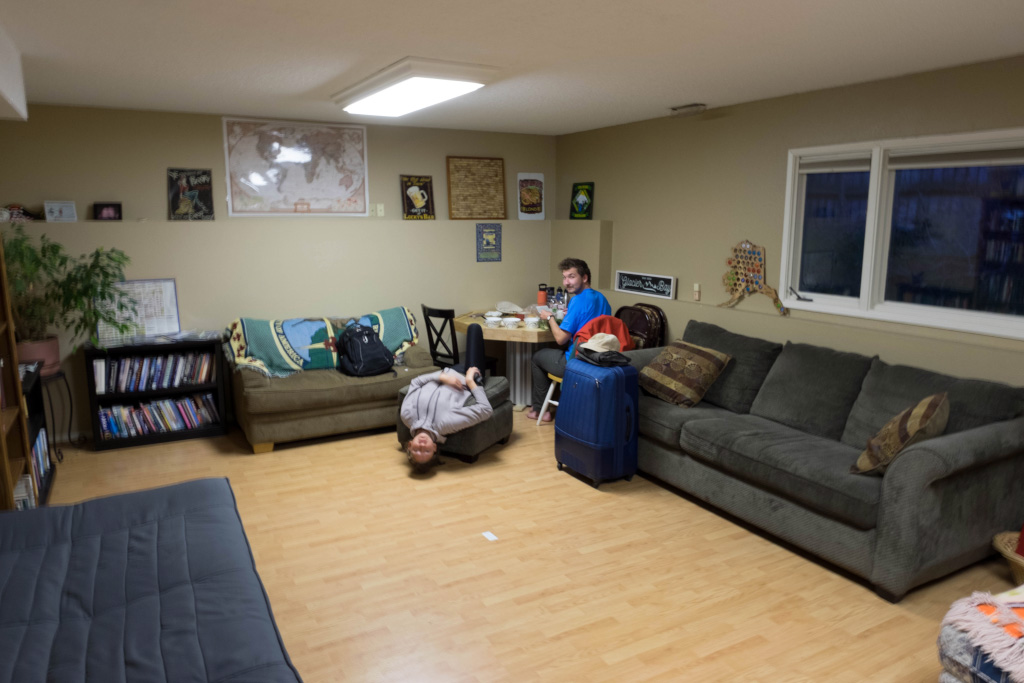 Первый этаж частного дома в Anchorage. Хозяева - пилот и стюардесса - были в рейсе. Дом остался под присмотром большой лохматой собаки. Мы тихонько вошли, опасливо поздоровались. Собака вильнула хвостом в сторону комнаты. Утром собака проводила нас до двери.