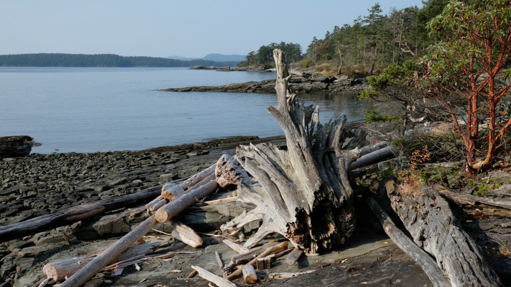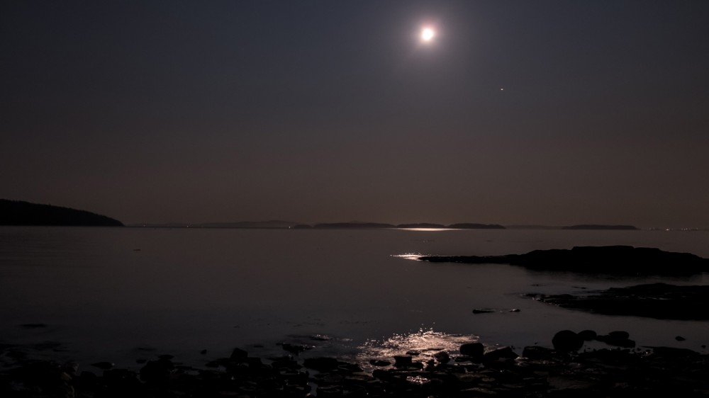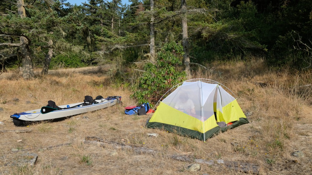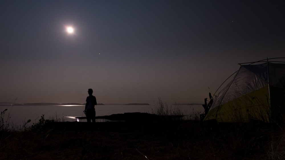На паром мы с Димой опоздали. И вместо того, чтобы в сумерках собирать палатку, в сумерках мы еще только надували каяк. На воде уже были в полной темноте, и шли ориентируясь на смутные темные силуэты островов. Рискованная авантюра, не повторяйте дома! В темноте не видно набегающих волн, и кажется, что каяк просто почему-то стал не очень устойчив. А ведь это не озеро и даже не залив, нам требовалось пересечь один из морских каналов. К счастью, как обычно в это время, ветра практически не было, течение только набирало свою силу, и мы благополучно достигли южной оконечности острова Portland. Там мы сверяя направление по гугл-мапсу отыскали бухточку и бросили бы якорь в ней (если бы он у нас был), а так просто вытащили наш каяк на берег.