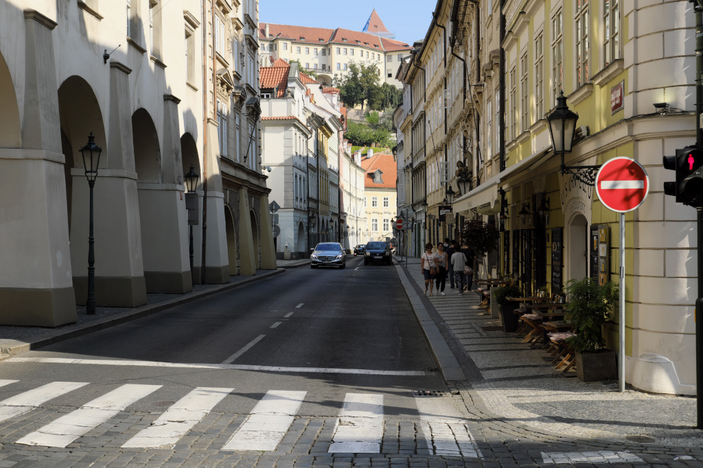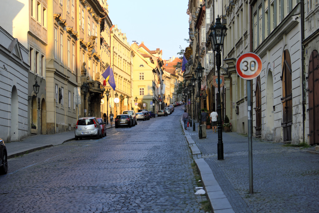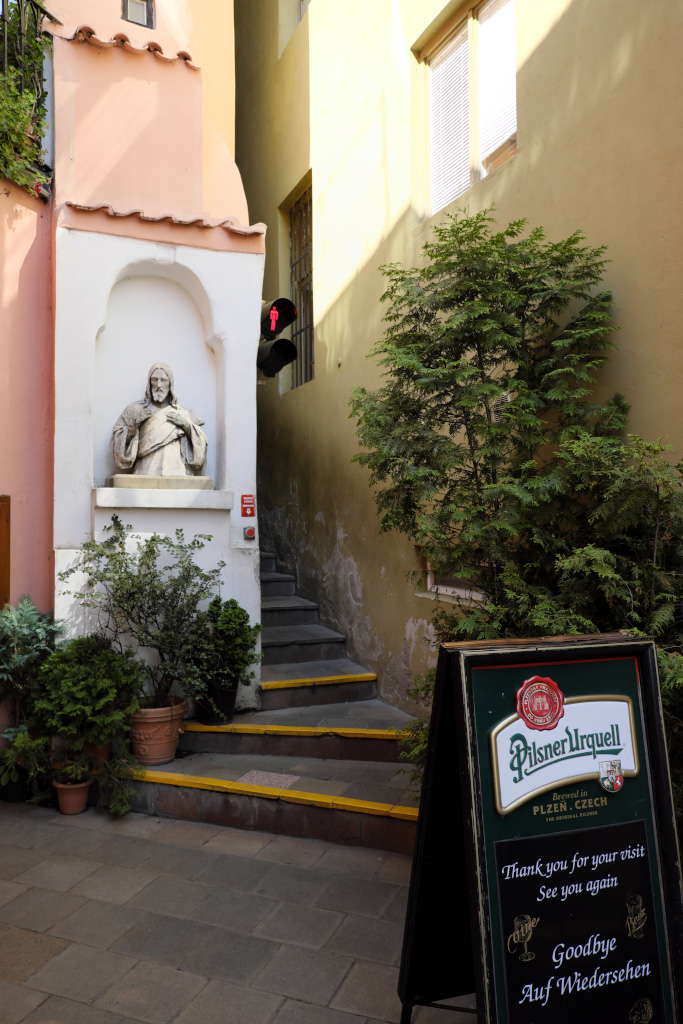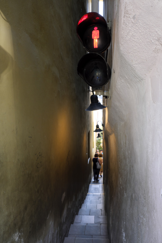 И опять самая узкая улица в Праге. Двоим на ней не разойтись, и для прохода по ней устроен специальный светофор, на который, впрочем, никто не смотрит.