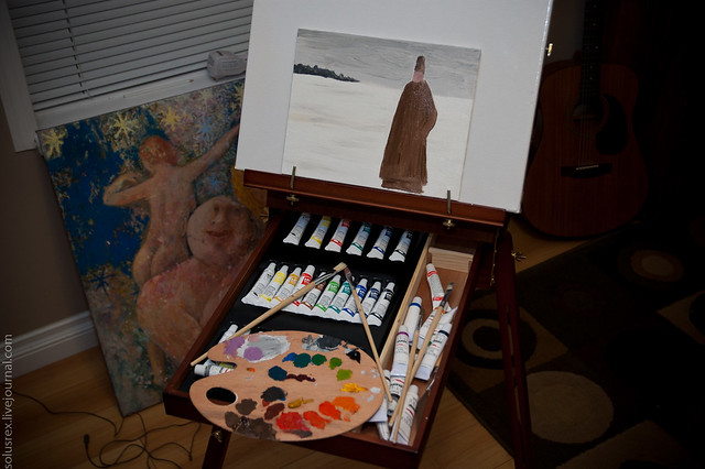 Сегодня, наконец, впервые в жизни выдавил маслянные краски на палитру и приступил к живописи. Начал с классики. Картина называется "Вечерний посетитель". Зима получилась вроде, а вечер - по-моему нет. Надо почитать в умных книжках как вечер делать. Наверное, надо добавить синей краски и сделать все потемнее.