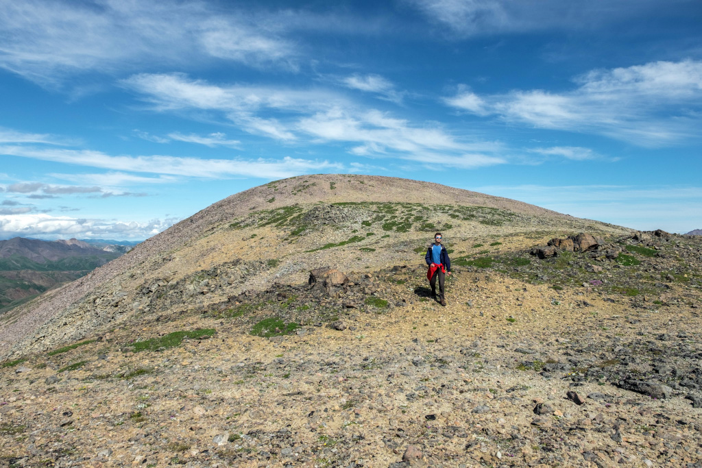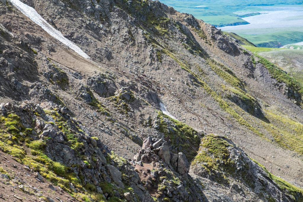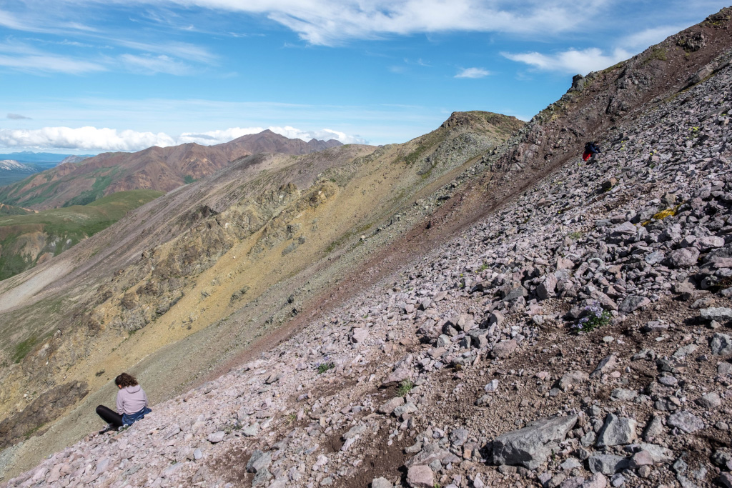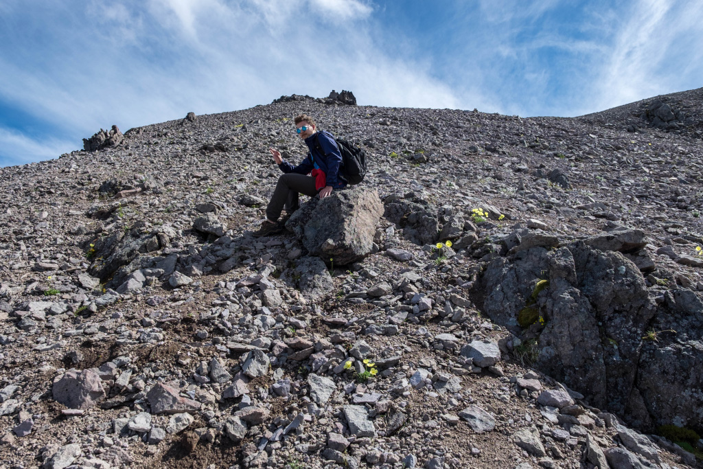 Чтобы не подниматься на другие вершины, решаем пройти траверзом по хребту и спуститься с другой его стороны. Это оказалось совсем непросто. Мелкие камни осыпаются под ногами, трудно держать равновесие.