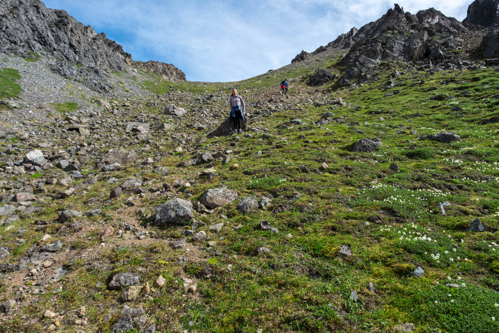 Долго не могли выбрать место для спуска, везде казалось слишком круто. В итоге пошли дальше, и спуск начали за большим снежным участком в правом верхнем углу. На нем я поскользнулся и всадил острый камень в ладонь.