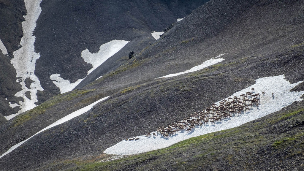 А потом мы увидели нечто удивительное. Большое стадо карибу прохлаждалось на одном из ледников. И ведь не сказать, что было уж очень жарко. Мы все были в куртках.