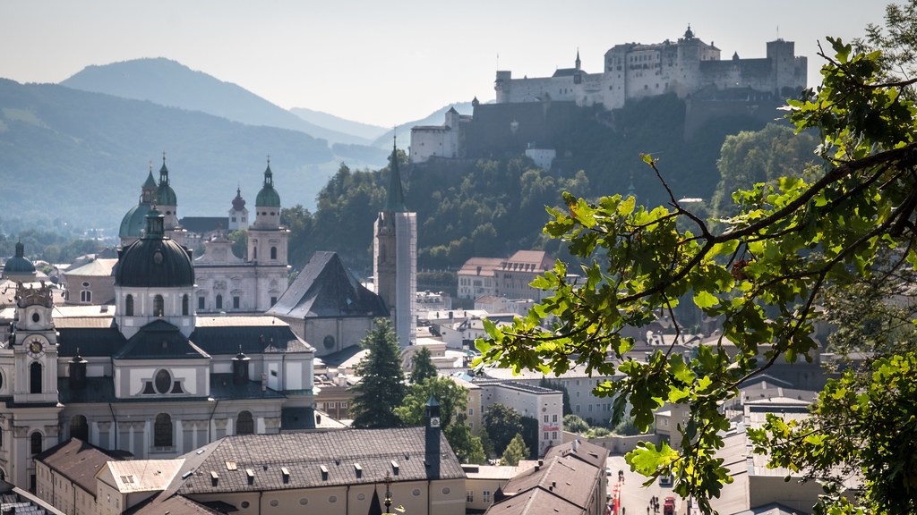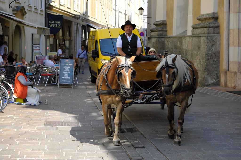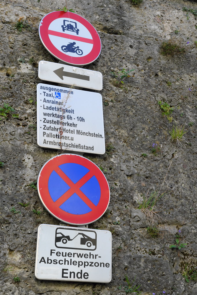 Для нас это был, пожалуй, самый нервный день из всей поездки. Город богат узкими извилистыми улицами с односторонним движением. На два метра промахнувшись мимо въезда в подземную парковку, мы двадцать минут объезжали город ради второй попытки. Гугль навигатор тоже в свою очередь нервничал и истерил указаниями невпопад. Когда мы попросили его доставить нас к замку Festung Hohensalzburg на высоком холме, навигатор решил поднять сперва наш культурный уровень и проложил путь к другому холму, там где музей современного искусства. Мы конечно знали, что в Европе узкие извилистые улочки, и поэтому уверенно поехали в гору по дорожке, скорее напоминавшую пешеходную, чем автомобильную. Нас немного смутил знак и длинный список непонятных слов, но мы рассудили, что у нас не мотоцикл, и не старинный автомобиль, и потому отбросив сомнения мы поехали вверх под бодрые команды Гугля.