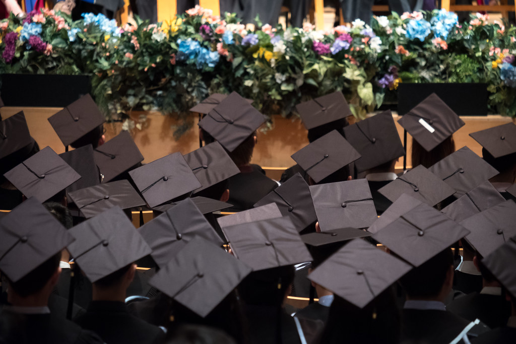 Родителей и гостей рассадили в зале, оставив передние ряды партера для выпускников. Под торжественную музыку в зал вошли и заняли свои места сперва студенты, а потом на сцену торжественно поднялся преподавательский состав, включая президента и ректора университета.