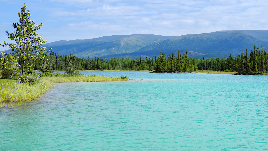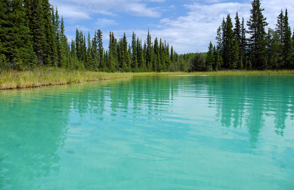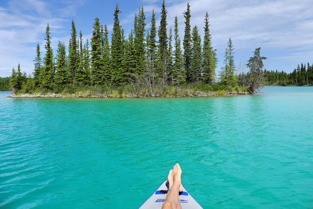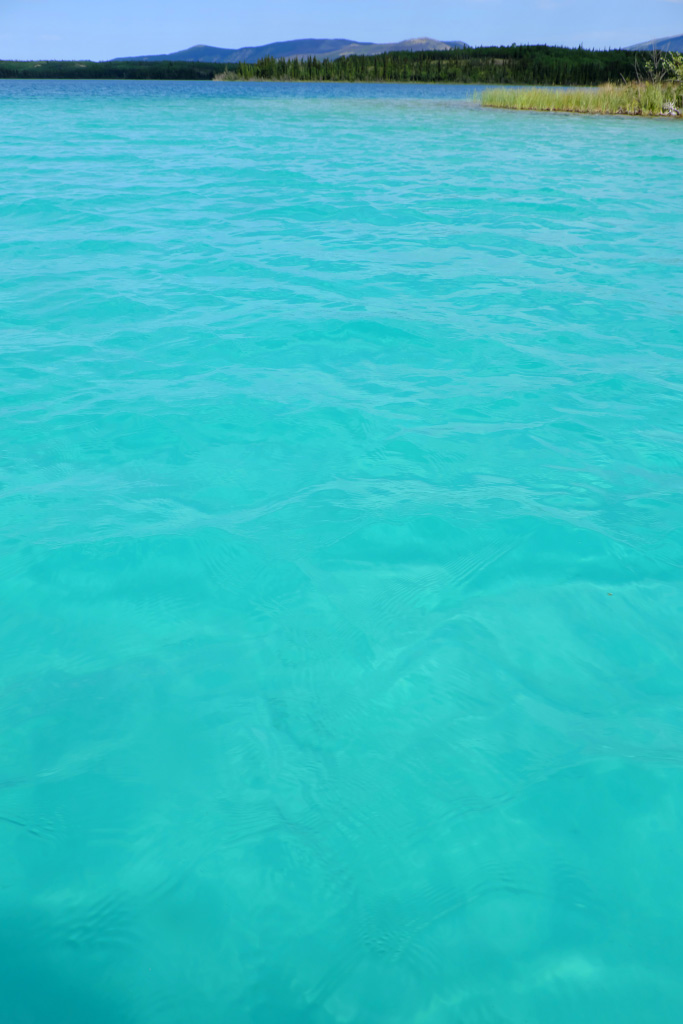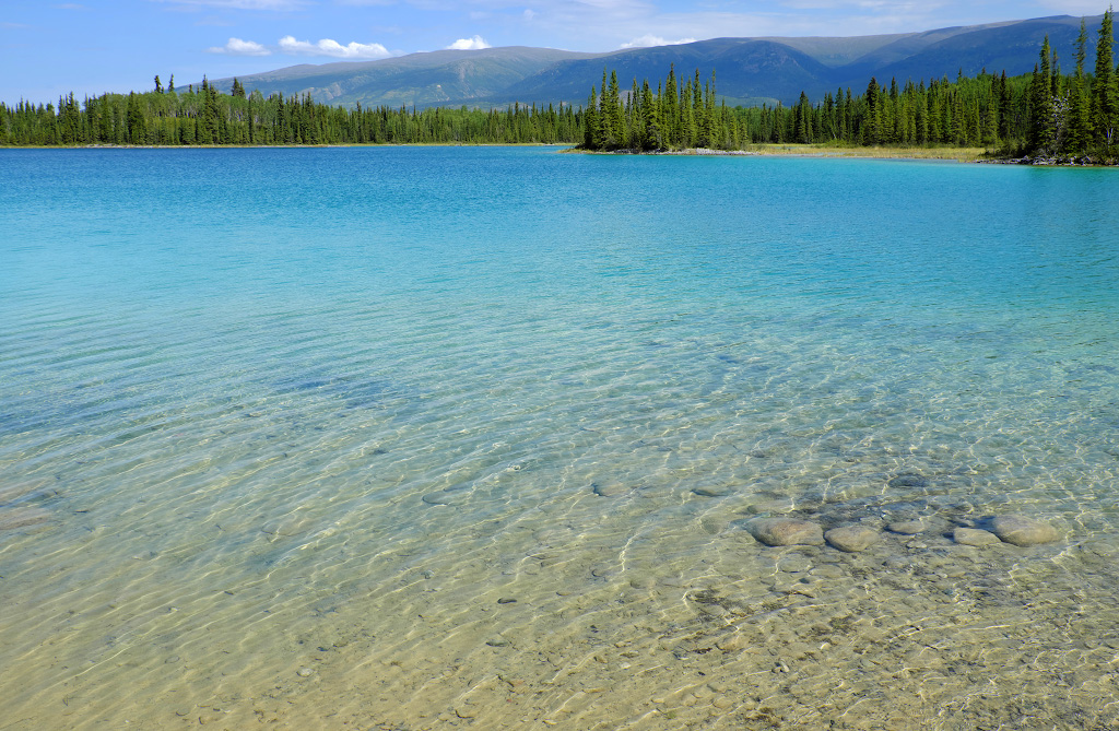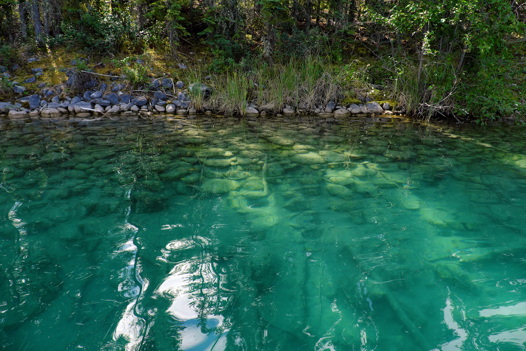 Чем не Карибы? Только мы не на Карибах, а на севере Британской Колумбии. Дно озера выглядит таким белым не от кораллового песка, а это какой-то особенный белый ил - он и просвечивает через лазурную ледниковую воду.