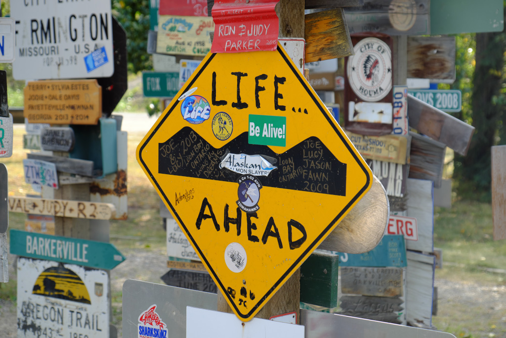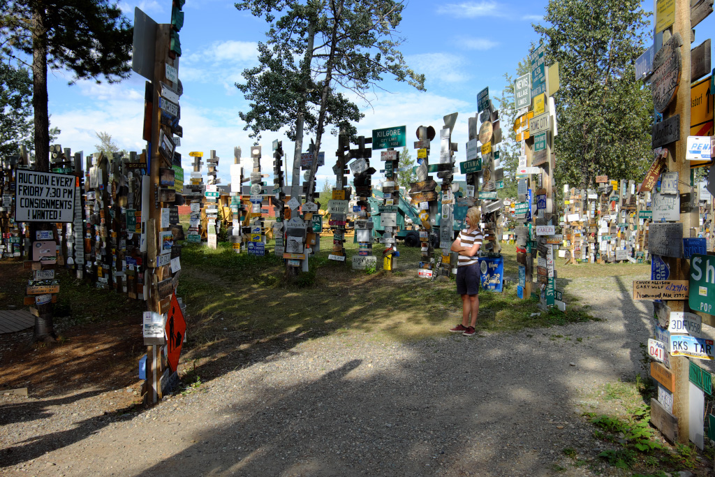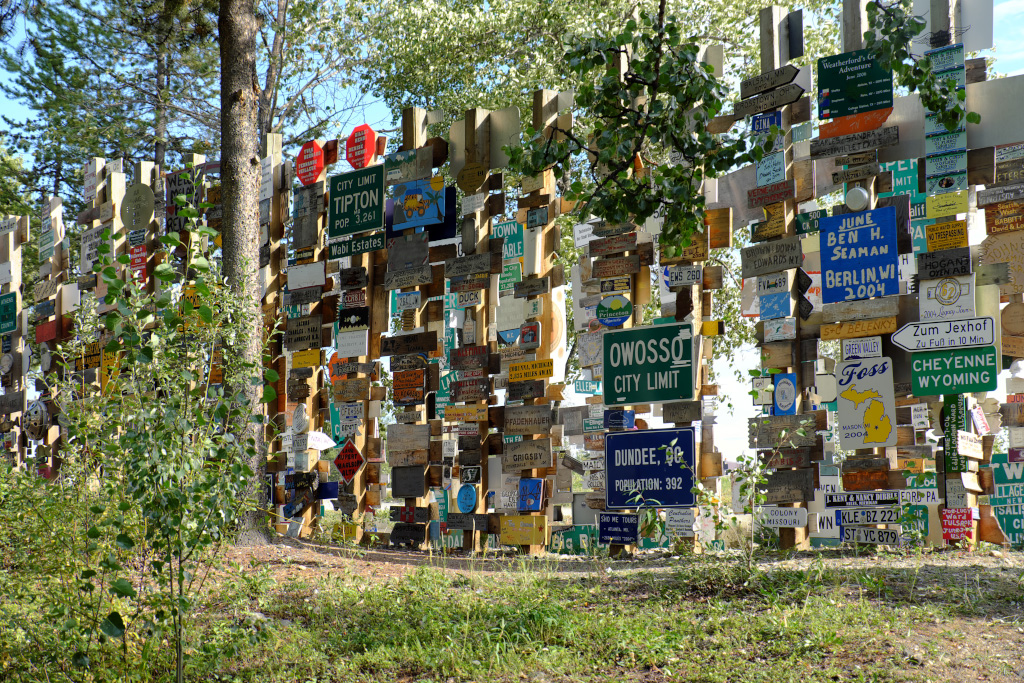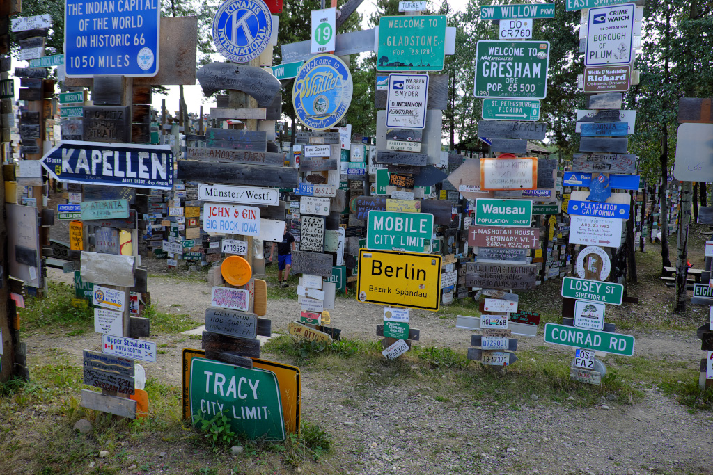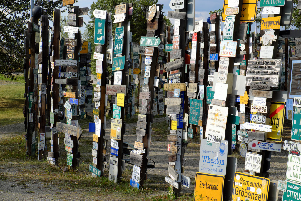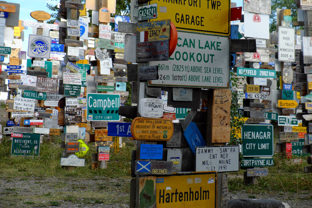 Для людей, не интересующихся взлетно-посадочными полосами, главная достопримечательнсть города Watson Lake - Posts Forest (лес знаков). Началось это с того, что пара американских инженеров - строителей Аляскинского хайвея, соскучившись по дому, поставила столб, а на него приколотили дощечки с указанием направления и расстояния до родных мест. И пошло-поехало! С тех пор тысячи людей привезли и прибили всевозможные таблички, и продолжают это делать - лес растет.