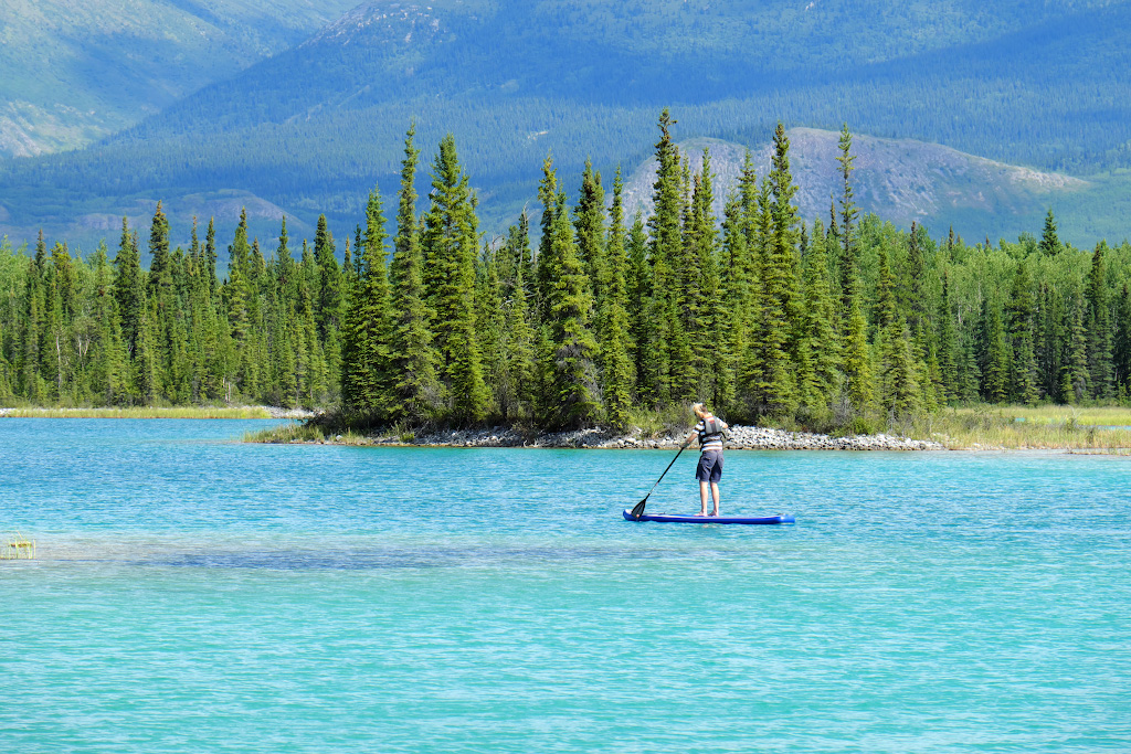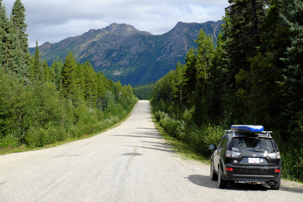 В поисках геокеша мы спустились под мост (у меня за спиной), и случайно обнаружили в конструкции моста такую волшебную точку, что если барабанить по ней ладонью, то весь мост гудит как очень большой колокол. Фантастические ощущения. На крыше нашего авто привязана SUP доска - было лень сдувать ее после вчерашнего катания по озеру Upper Gnot. Целая эпопея была затащить 4-х метровую доску в наш номер в гостинице в Dease lake. Так и сяк, она не проходила в дверь номера в узком для неё коридоре. Так и оставили ее в проходе - все же лучше, чем на улице.