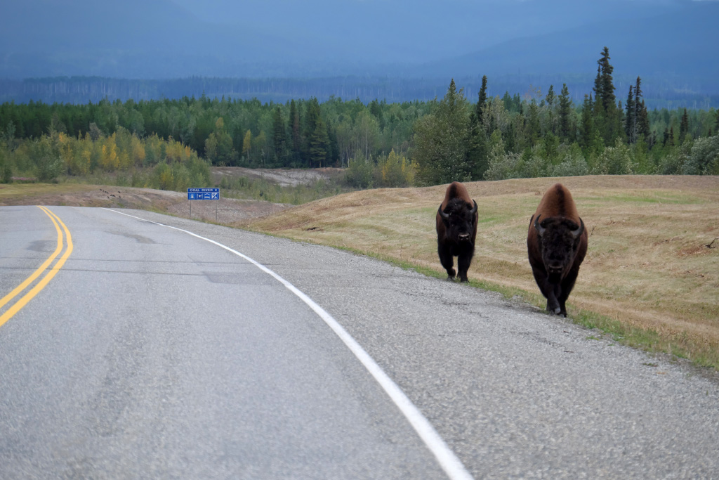 Как обычно, вдоль дороги нам попадалась разная живность. Несколько раз видели бизонов - по одиночке, парами и даже целое стадо.