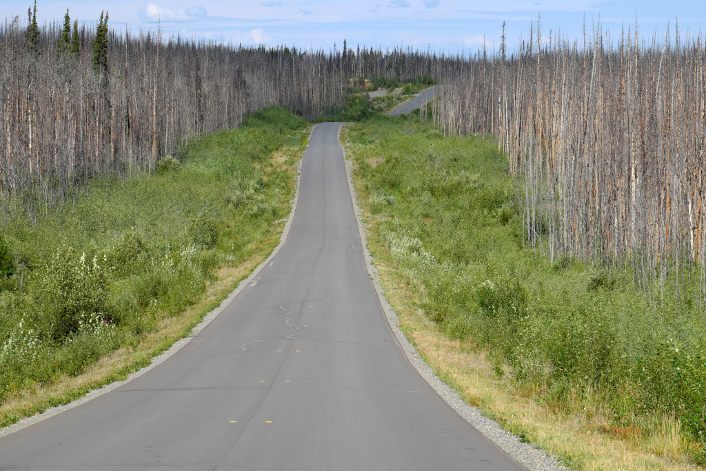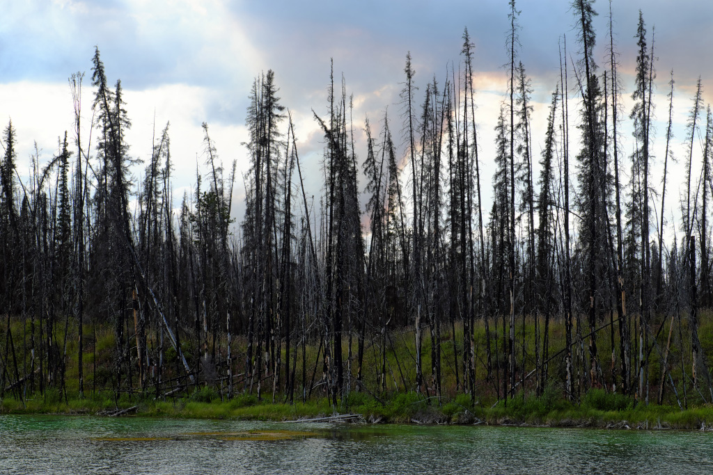 Продвигаясь дальше на север, попали в зону старых лесных пожаров. Пожар был лютый, сгорели многие километры, даже десятки километров леса. Удивительно, но горела только хвоя. Стволы и даже тонкие ветки остались нетронутые.