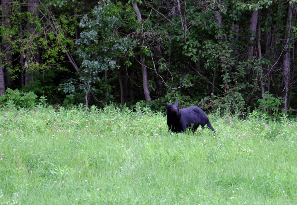 Черный медведь брел куда-то по своим делам. Вообще, медведей видели много, обычно когда они пересекали дорогу. Но в таких случаях они исчезали в лесу быстрее, чем можно было успеть достать фотоаппарат.
